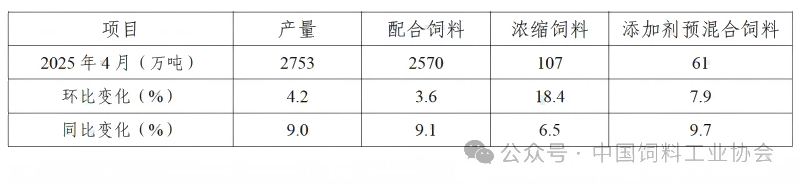 2025年4月,全国工业饲料产量2753万吨,环比增长4.2%,同比增长9.0%。其中,配合饲料、浓缩饲料、添加剂预混合饲料同比分别增长9.1%、6.5%、9.7%。饲料产品出厂价格同比明显下降,配合饲料、浓缩饲料出厂价格环比小幅增长,添加剂预混合饲料出厂价格环比以降为主。饲料企业生产的配合饲料中玉米用量占比为42.1%,同比增长4.2个百分点;配合饲料和浓缩饲料中豆粕用量占比为12.1%,同比下降1.3个百分点。