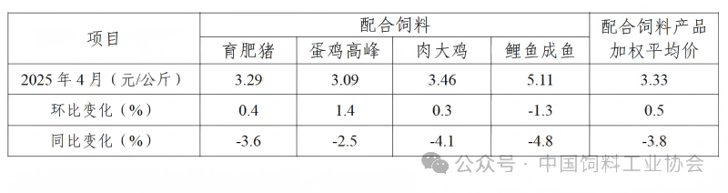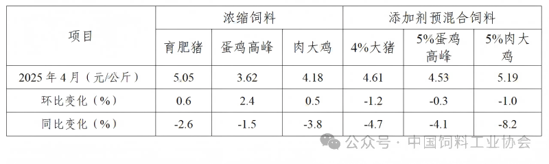 表3 2025年4月饲料企业浓缩饲料和添加剂预混合饲料平均价格