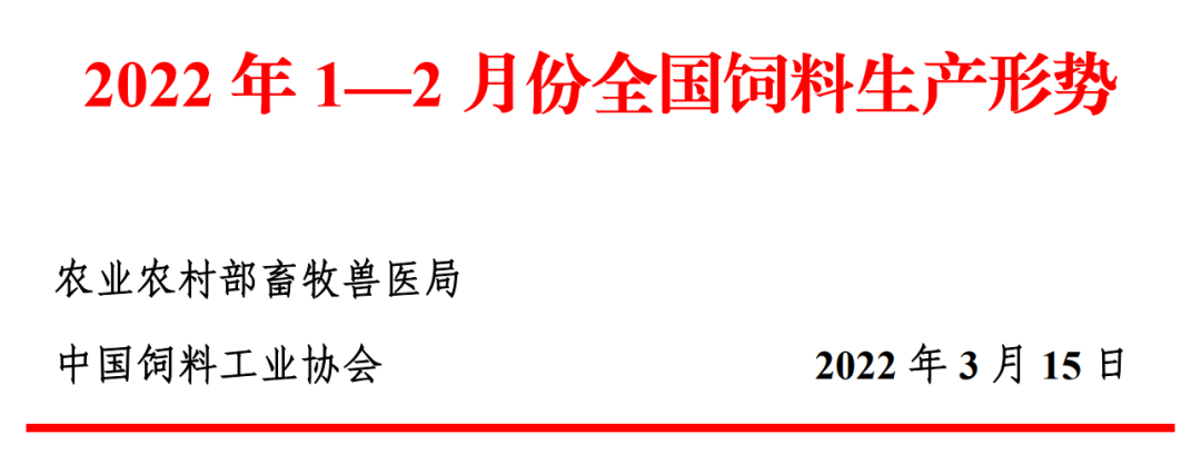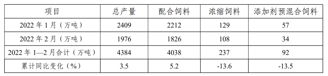 据样本企业数据测算,2022年1—2月,全国工业饲料总产量4384万吨,同比增长3.5%。从品种看,猪饲料产量2126万吨,同比增长2.9%;蛋禽饲料产量525万吨,同比下降0.9%;肉禽、水产、反刍动物饲料产量分别为1265万吨、167万吨、251万吨,同比分别增长4.2%、31.3%、3.7%。