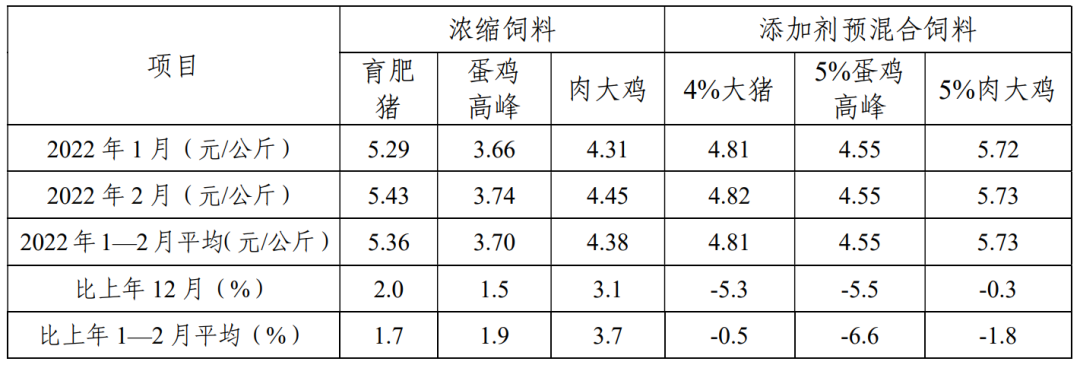 表4 2022年1—2月饲料企业浓缩饲料和添加剂预混合饲料平均价格