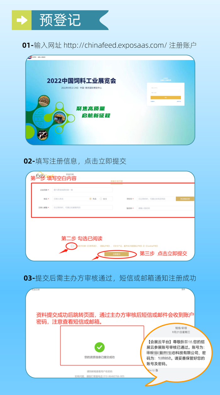 各位展商朋友们,大家好!饲料展历经26年的精心耕耘,已成为国内饲料行业规模大、专业化程度高、影响力传播力强的专业展会。随着信息化的发展,饲料展也逐渐进行信息化升级,2022年展会首次启用线上签约,2023年展会再开新篇,启动线上报名功能。为了便于大家及时报名,现将预登记及报名操作流程发布。请及时注册账户,为报名做准备哦!